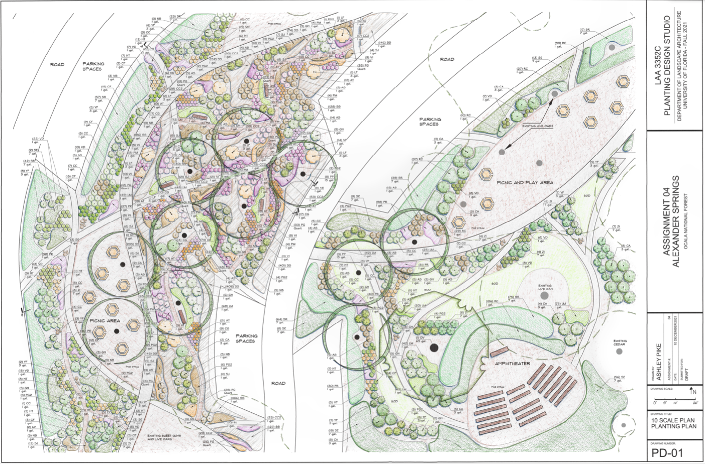 For the 2021 Planting Design Studio, UFDCP chose Alexander Springs, a popular swimming hole in the forest, as the site for the class native planting project. Students worked in teams to develop conceptual master plans and then individually on planting plans for the entry drive, parking lot and spring approach where people enter the water. FANN member native plant professionals volunteered to join students on their site visit, provide two native plant nursery tours, review preliminary plans in person and consult with faculty, students and forest service staff at a final presentation of twenty different planting designs.