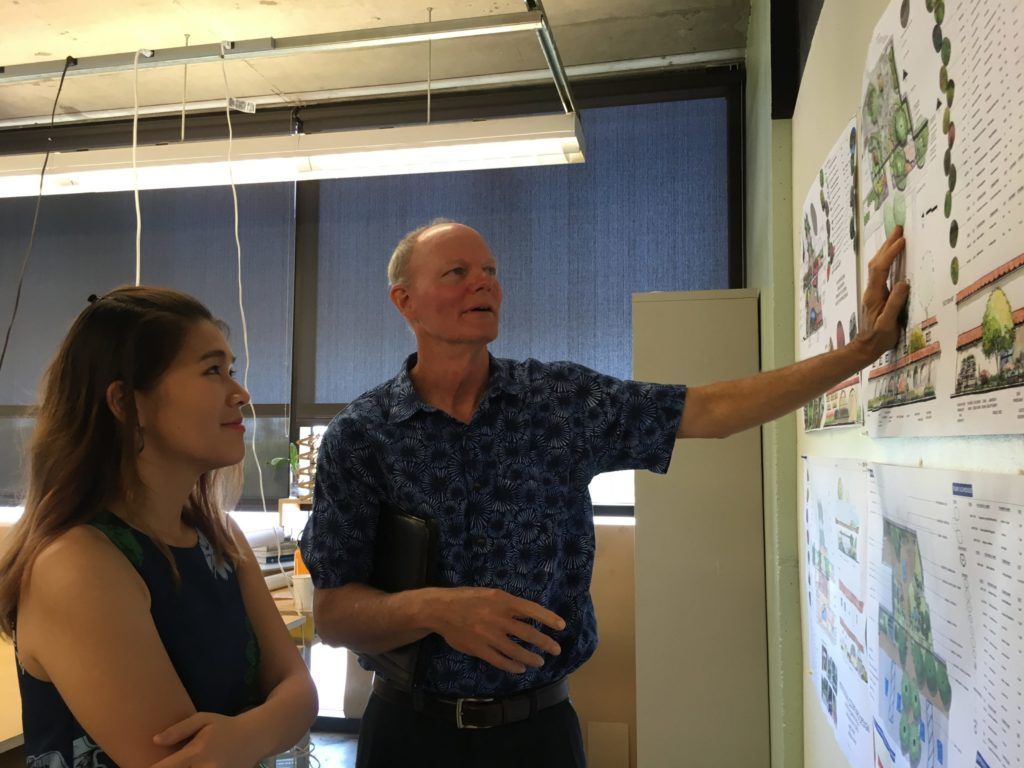 Landscape architect Larry Teague, Zamia Design, discusses plan with student.