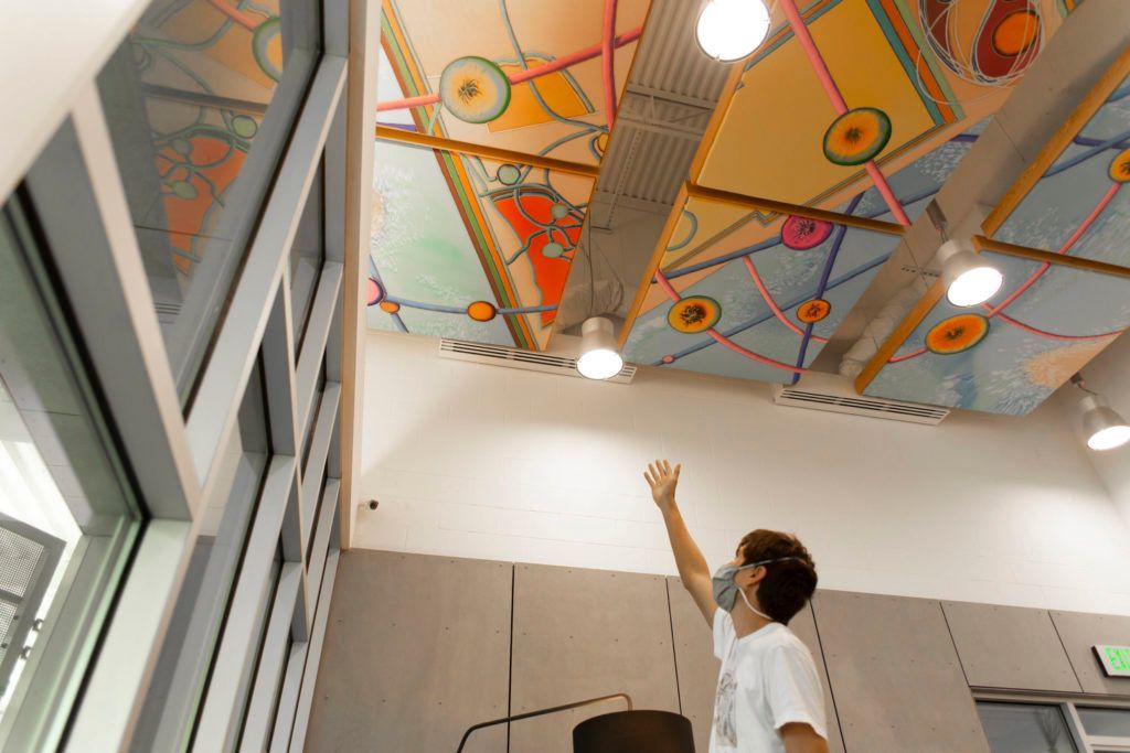 Artist Evan Galbicka shows his art installation that maps the grounds and pollinator flight paths he used for organizing a landscape incorporating native plants at PULP Arts in Gainesville, Florida.